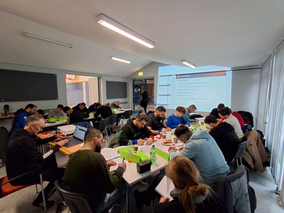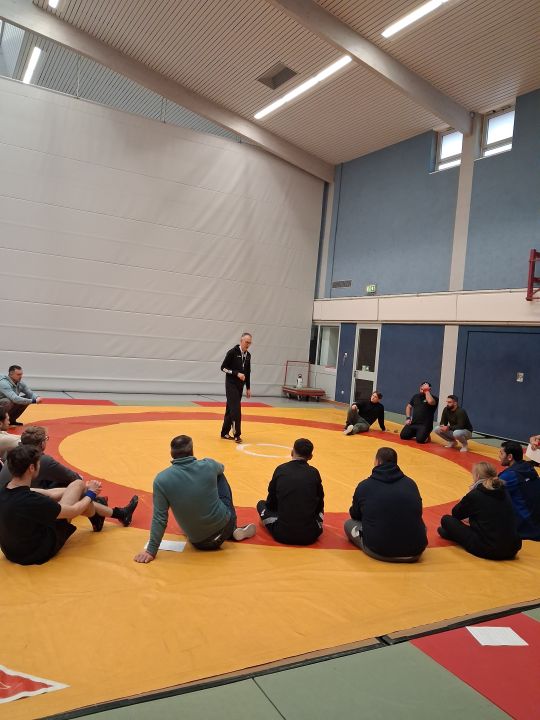 Erstmals in diesem Lehrgang wurde neben dem theoretischen Unterricht auch die praktische Anwendung auf der Ringermatte in den Fokus gerückt. Die Anwärterinnen und Anwärter konnten ihr theoretisches Wissen direkt in der Praxis anwenden und so wertvolle Erfahrungen sammeln. Zur Mittagszeit gab es eine Stärkung mit Pizza, sodass der Austausch in entspannter Atmosphäre fortgeführt werden konnte.